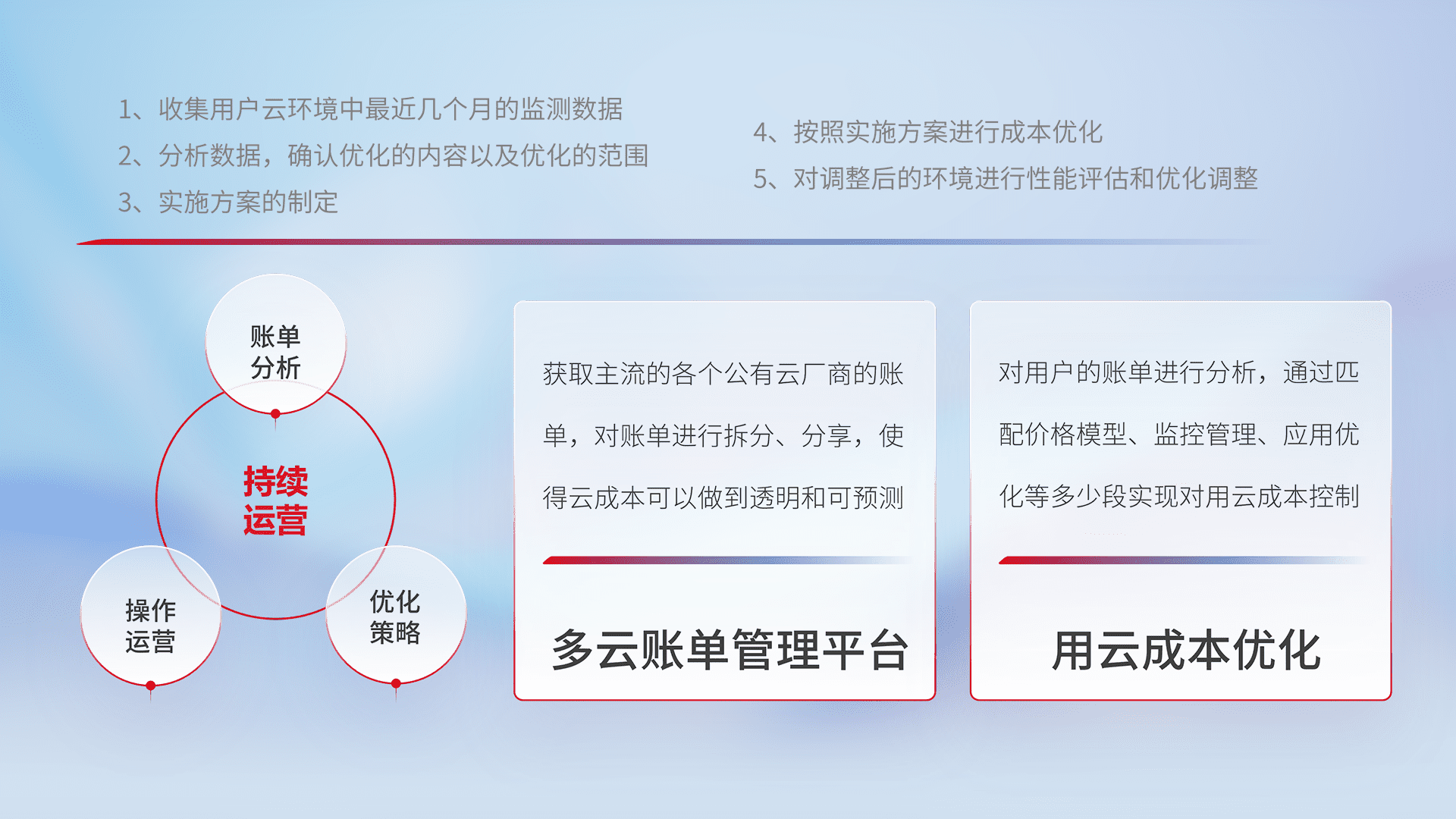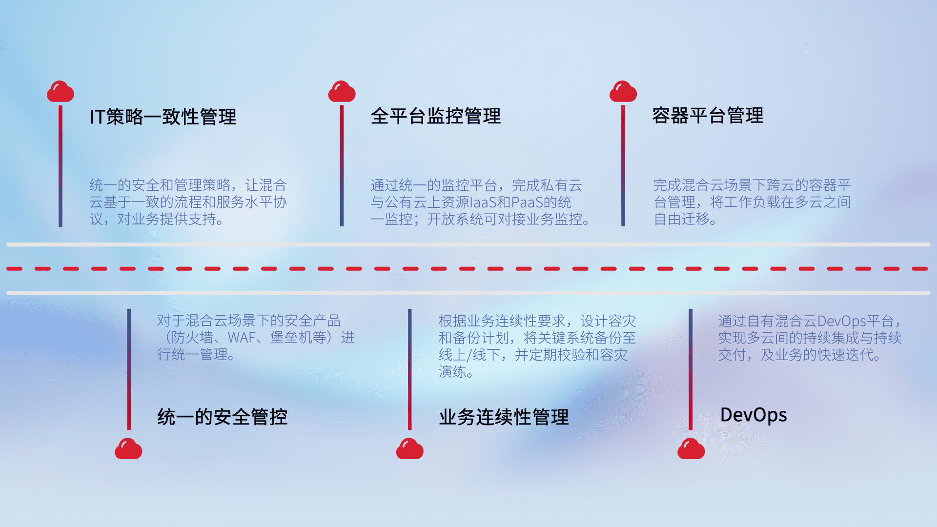 通过多云纳管,,,以统一的资源数据模型把客户的云资源进行抽象和封装,,,进而实现对多云资源的统一操作,,保障云资源管理的可靠性、、、、稳定性与可用性。。。。量身定制化运维内容,,,,配置、、、开发运维、、、、补丁管理、、、备份、、、、监控、、、认证和访问管理、、、审计和日常巡检等,,保障在用云过程中的可靠度,,,,稳定度以及高可用率。。