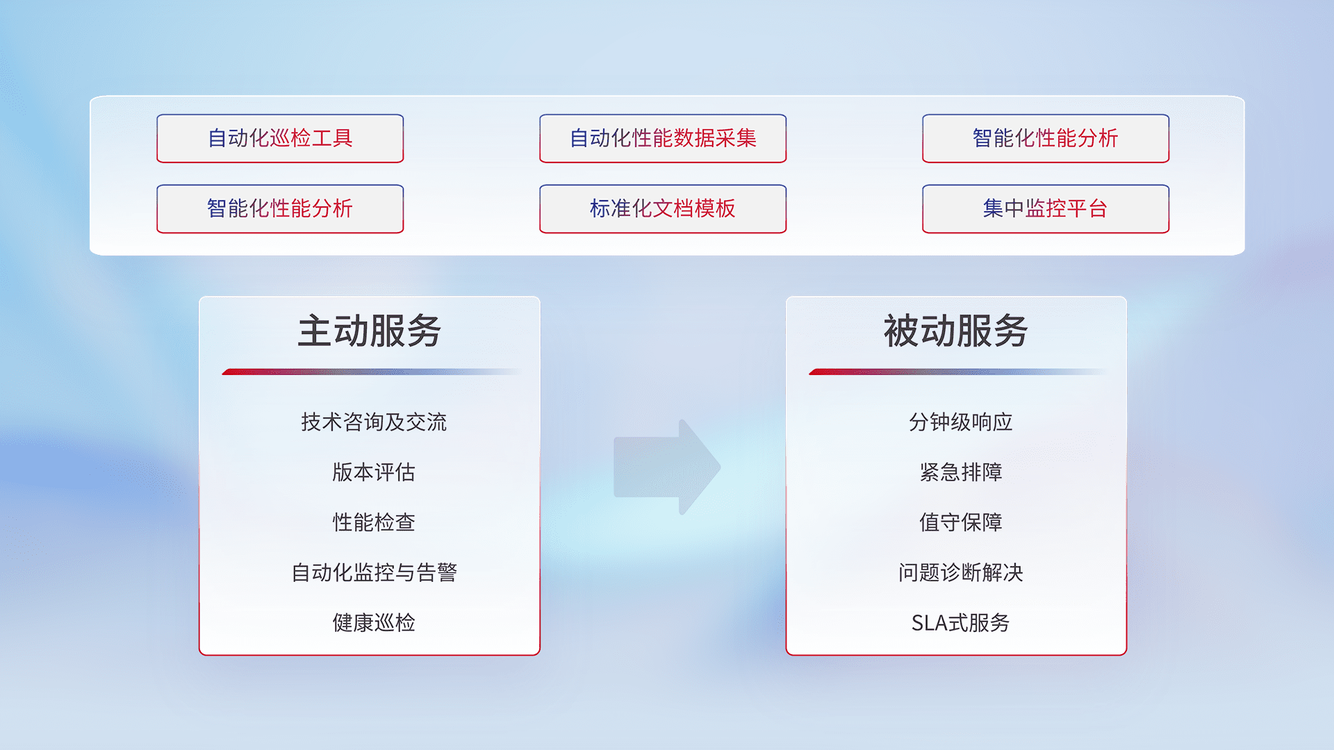 智能化工具和标准化文档,,,,保障服务质量,,提供主动服务(包含技术咨询、、版本评估、、、性能检查、、、、自动化监控与告警、、健康巡检)和被动服务包含(分钟级响应、、紧急排障、、、值守保障、、问题诊断解决、、SLA服务)。。