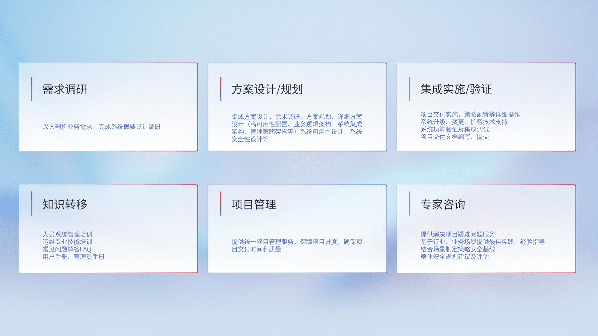 针对客户行业特性,,将宏观的安全战略和需求,,,,通过专业的交付服务,,,实现项目落地,,,,为客户提供标准规范的集成交付服务。。。